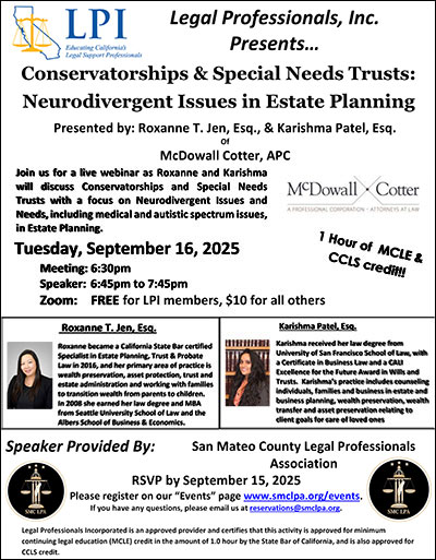 September 16, 2025 – SMCLPA General Meeting & Webinar on “Conservatorships & Special Needs Trusts: Neurodivergent Issues in Estate Planning”